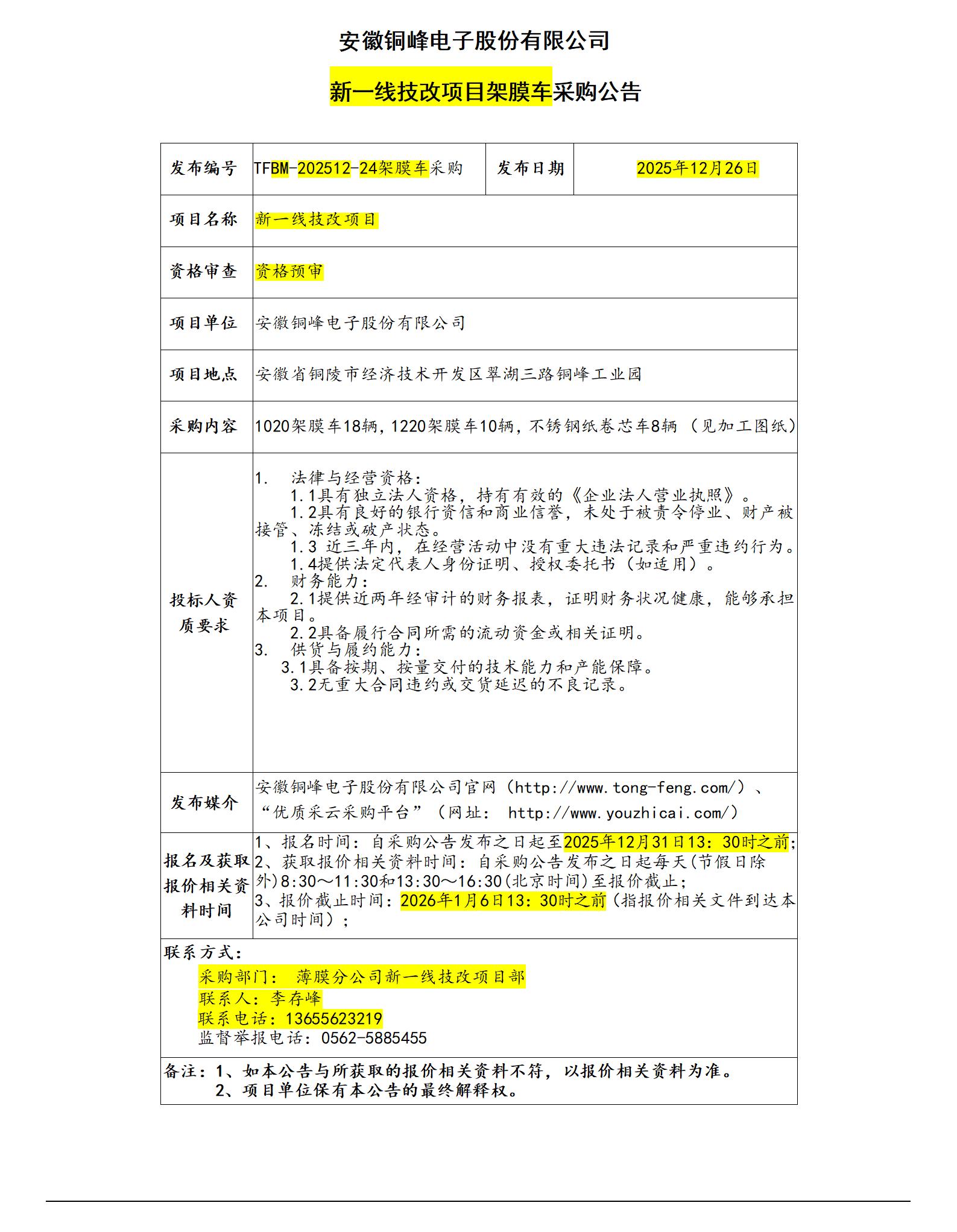 安徽銅峰電子股份有限公司 (新一線架膜車采購招標公告)_01